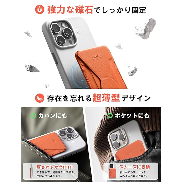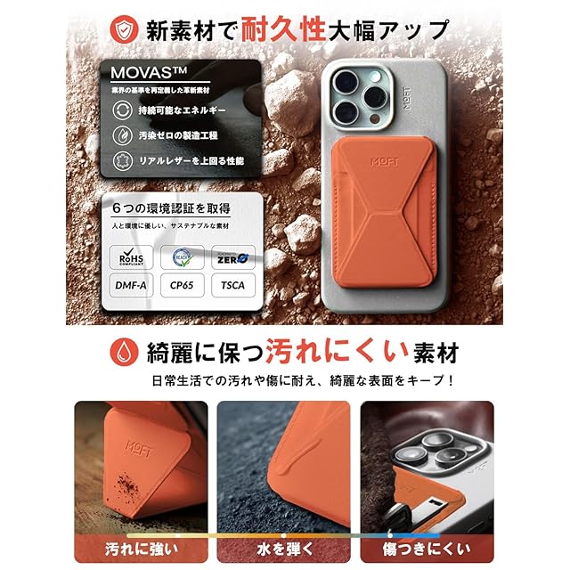 ✨【最新のヴィーガンレザー「MOVAS」採用!洗練されたスリムデザインで高耐久性】 「MOVAS」は、MOFTが誇りを持って開発したヴィーガンレザーで、その特長は一見の価値があります。この素材は驚くほど繊細な手触りを備えながら、同時に高い耐久性を持ち、さらには環境への優しさも追求しています。その結果、この素材を使用したスマホスタンドは、優れた張力と靱性を誇り、ポケットにキーホルダーやカードキーと一緒に収納しても傷がつきにくいのが特長です。洗練されたスリムデザインは、ユーザーに高級感をもたらし、日常のスタイリッシュな使い勝手を追求した結果として、このヴィーガンレザーのスマホスタンドは他と一線を画しています。