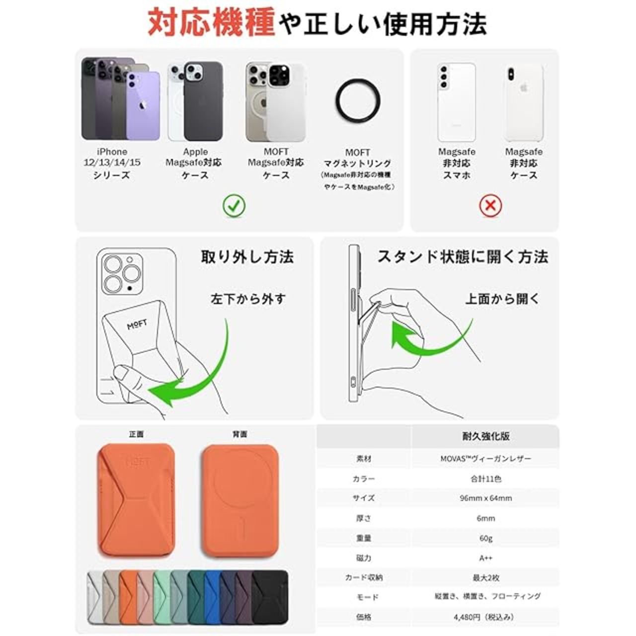 ✅【対応機種と注意事項】iPhone 16/15/14/13/12全シリーズに対応できます。または、MagSafe機能があるスマホケースやマグネットリングと併用することで使用可能です。*MOFT Snapケースと併用すれば、磁力がさらにアップ!