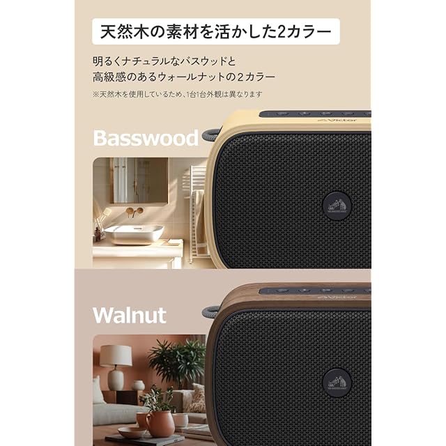 ✅天然木※1なのに水回りで使える___世界に一つだけの自然な木目や風合いを楽しめる天然木(バスウッド、ウォールナット)を採用したインテリアと調和するデザイン。なのに、お風呂やキッチンなどで使える防水・防塵仕様(IP67相当※2)です。 ※1:天然木を使用しているため、1台1台外観は異なります。※2:JIS防塵保護等級6級・防水保護等級7級(IP67)相当。充電用USB端子およびAUX IN端子のカバーを閉じた状態による。