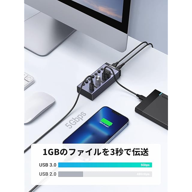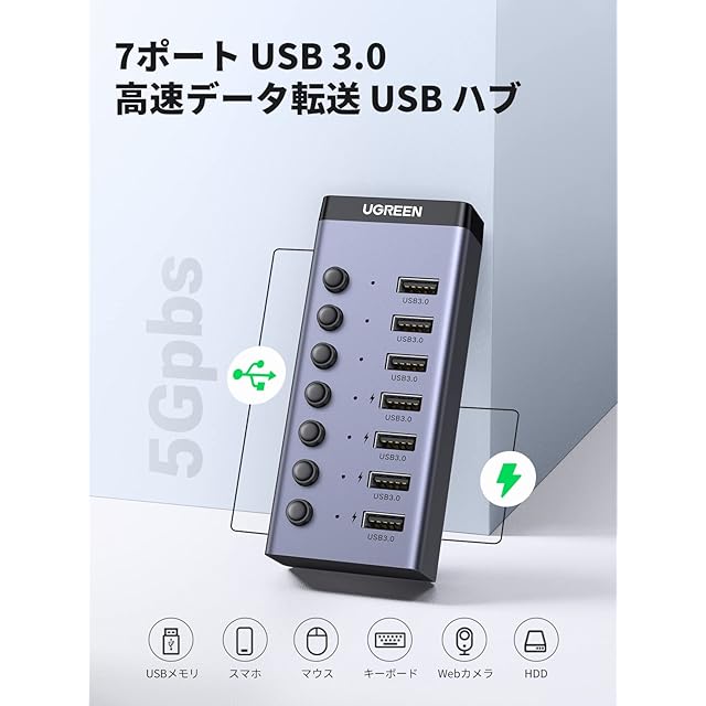 商品名:UGREEN USB ハブ 7ポート3.0 hub 5Gbps高速伝送 セルフパワー対応 DC12V/2A ACアダプタ付き 独立スイッチ付 C to Aケーブル 1m 7ポート拡張 HDD/USBメモリ//キーボード/マウス/USBファン/プリンタなど対応 アルミ製