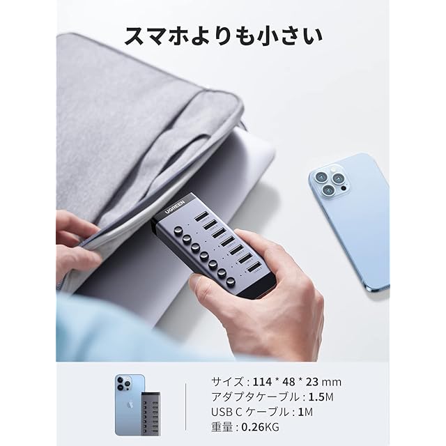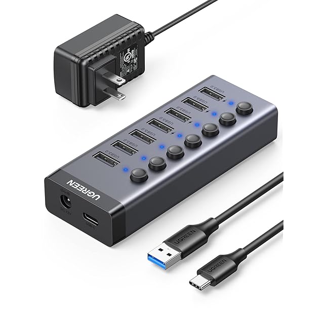 UGREEN USB ハブ 7ポート3.0 hub 5Gbps高速伝送 セルフパワー対応 DC12V/2A ACアダプタ付き 独立スイッチ付 C to Aケーブル 1m 7ポート拡張 HDD/USBメモリ//キーボード/マウス/USBファン/プリンタなど対応 アルミ製 | TREND DESIGN 家電専門店