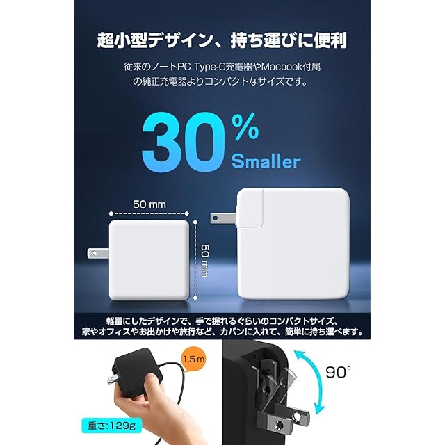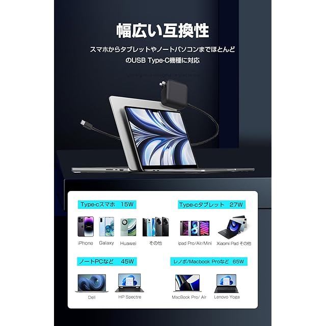 商品名:ノートパソコン 充電器 type-c PD 65w Macbook pro/レノボ/Lenovo交換用充電器【GaN+(窒化ガリウム)採用/PD 65w/45w急速/1.5mType-Cケーブル一体型/折畳式プラグ/PSE】acアダプター Mac電源アダプタ 軽量 持ち運び Switch/Mac Book Pro 各種USB-C機器対応
