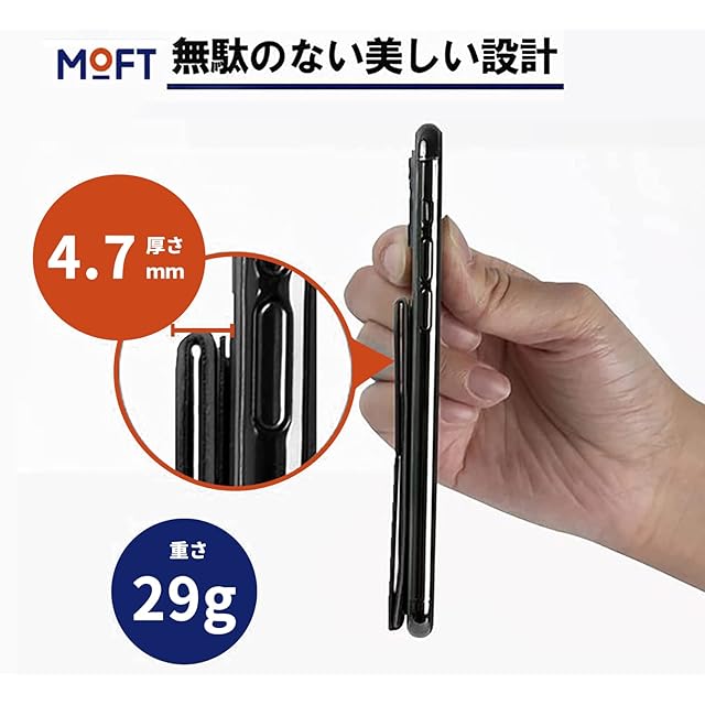 【最大3枚のカードを収納可能】MOFT Xはカードを3枚まで収納できるスキミング防止カードケース付きです。 カードを収納しても見た目すっきり!外からカードが見えないので安心。 NFC機能を採用しているApple Pay やGoogle Payの使用に支障はなく、 安全性と利便性を両立しています。コンビニ、スーパーまでちょっとした お買い物、もうお財布は必要ありません!
