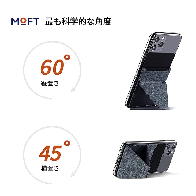 【 人間工学設計】 人間工学によると、最もスマホが見やすい角度は60度だといわれています。 MOFT Xを使用することで、瞬時にスマホを60度に固定し、快適な姿勢でお使いいただけます。 カフェやご自宅でYouTubeなどの動画サイトを楽し む場合にも、MOFT Xなら縦から横への切り替えも楽々、さっとスマホを横に向けるだけで 完了です。動画を一時停止したり、角度を調整したりする手間はかかりません。