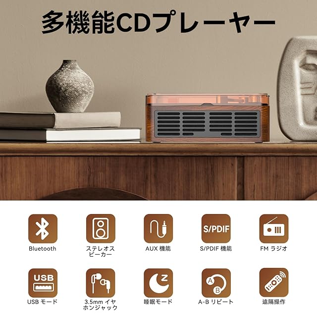 「様々な場合で多様なファイルに対応」このCDプレーヤーはCD/CD-R/CD-RM/CD-G/MP3/WMA/WAVなどのフォーマットを適したので幅広く使えます。さらに、実用性と高級感がいっぱいので、部屋、パーティー、レストラン、語学学習、ヨガ、子供教育など様々な利用場合もよく似合います。