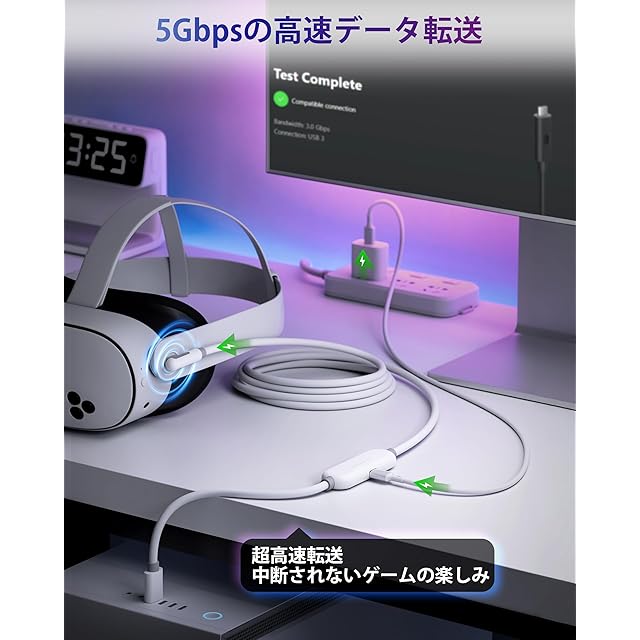 ★【USB 3.0-5Gbps】5Gbpsの伝送速度をサポートするUSB 3.2 Gen1(USB 3.0)リンクケーブルです。Questに接続すると、2.5〜3.2Gbpsの帯域幅(コンピューターのパフォーマンスによって異なります)を実現し、より高い解像度とリフレッシュレートをサポートして、高品質のVR体験に十分な帯域幅を提供します。