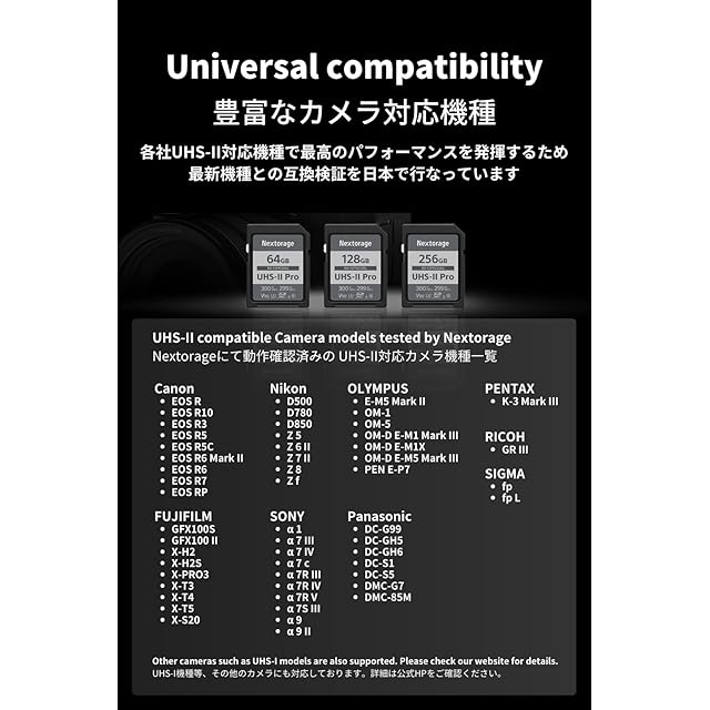 Nextorage NX-F2PROシリーズ UHS-II SDカードは、最大転送速度(読み出し:300 MB/s・書き込み:299 MB/s*)はUHS-II規格値のほぼ上限となる転送速度を達成しており、撮影から撮影後のデータ転送作業にいたるまで快適なワークフローを提供するメモリカードです。また、高頻度の書き換えに強いpSLC NANDメモリの採用により、データの保存性と耐久性に高い効果を発揮します。(*Nextorage 内部テストによります。実際の性能は環境によって異なる場合があります。UHS-II 非対応の機器では、インターフェースの制限により伝送速度が異なります。) SDビデオスピードクラスでSDXCカード最上位規格のV90(最低転送速度:90 MB/s)に準拠しており、4Kや8Kでの高精細な動画撮影やRAW画質での高速連写に対応します。高速データ転送により、デジタル一眼レフ・ミラーレスカメラやプロ用シネマカメラ等での安定した8K動画撮影をサポートします。高速書き込み性能によりバッファ解放時間(データの書き込みが完了するまでの時間)が短縮されスポーツや鉄道、動物などの連続撮影で決定的な瞬間を逃しません。連続撮影から撮影画像チェックへの流れも、より少ない待ち時間でスムーズに行えるため、書き込み待ちのストレスから解放されます。