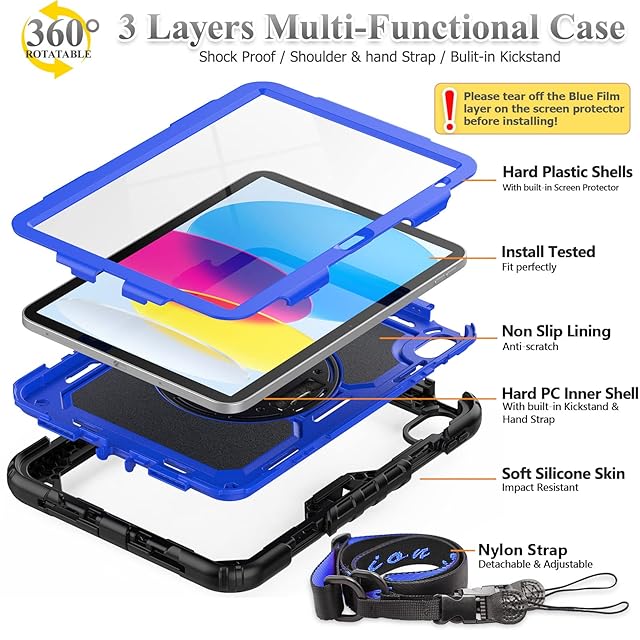Product Descriptions</b><br><br><b>Features</b><br>1.Built-in kickstand will makes you using your case for ipad 11th 10th Generation easily, when you are watching video or playing games.<br>2.360 degrees rotating/Shoulder Strap are more convenient for you to carry your case for ipad 11th 10th Generation 2025 2022 / 11th gen/ 10th gen case for ipad 11/10.9 inch. <br>3.Colourful design can make your case for ipad 11th/10th Generation looks fashionable.<br><b>Shock prevention</b><br>Keeps case for ipad 11th/10th Generation away from Shock, prolonging the lifetime of case for ipad 11 / case for iPad 10.<br> <b>Dust prevention</b><br>Port plugs of the case protect dust from entering into case for ipad 11th/10th Generation's screen, making case for ipad stay clean and debris free.<br><b>Anti-scratch function</b><br>Guard against fingernails or other sharp objects scratching 11th 10th Gen case for ipad for maintaining case for ipad 11th 10th Generation's complete appearance.<br><br><b>Package Contents</b><br><br><b>1 x case for ipad 11th 10th Generation 11/10.9 inch 2025/2022</b> >>> 3 pieces combination installation, heavy duty full-body case for ipad 11/10, with portable shoulder strap, built-in kickstand, PC & silicone material.<br><b>1 x Portable Shoulder Straps</b> >>>The shoulder strap is easy to attach and remove, it can use together or <br>separate with your case for ipad 11th 10th Generation. With the strap can make your case for ipad using easily when you go to school, to work and on vacation without the need for a purse, bag or backpack. It can hang from anywhere for your better entertainment.<br> <b>1 x Clean Cloth</b> >>> Lint free, soft, reusable, easy to wash and quick drying.<br> <b>1 x User manual front card</b> >>> Our user manual front card can help you install it easily & clearly.<br><br><b></b><br>SEYMAC stock Team is a professional high-quality team servicing for customers when you're purchasing SEYMAC stock case for ipad 11th 10th generation.<br>