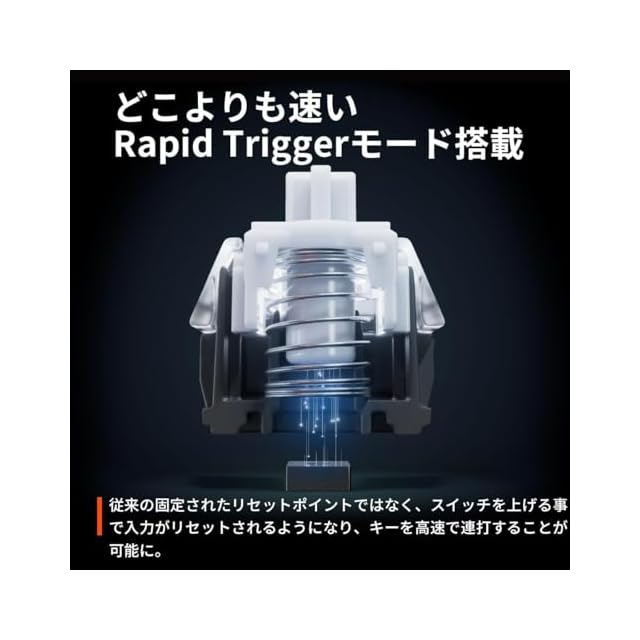 【どこよりも速いRapid Triggerモード】従来の固定されたリセットポイントではなく、スイッチを上げる事で入力がリセットされるようになり、キーを高速で連打することが可能に。