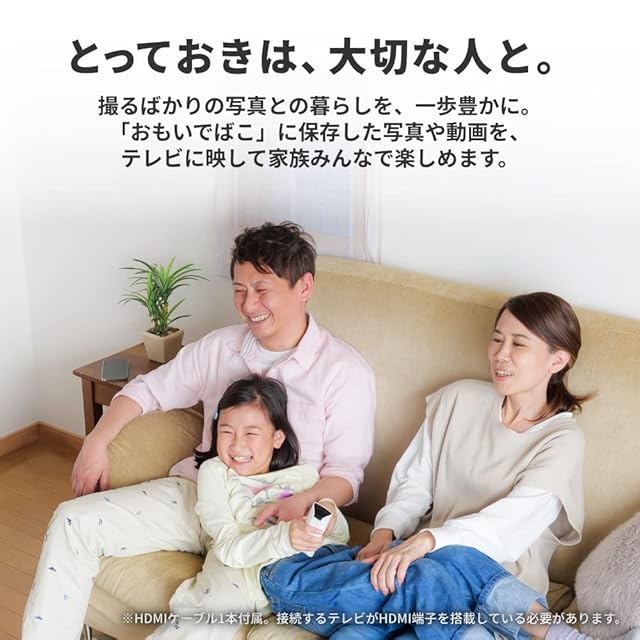 【家族みんなで楽しめる】付属のHDMIケーブルでテレビにつなぐだけ。スマホやカメラにしまったままの写真や動画を「おもいでばこ」に集めて、大切な人と一緒に楽しめる。