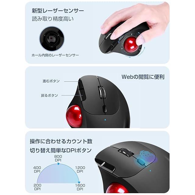 【多彩なボタン機能が充実】快適性と使いやすさに優れたトラックボールマウスには、左右のボタンとホイールに加えて、使い方に合わせてカウント数を変えられるDPIボタンが装備されています。このDPIボタンにより、カーソルの速さを200カウント、400カウント、800カウント、1200カウントと1600カウントの5段階で切り替えることができます。これにより、Excelや描画などの詳細な作業から画面を広く使う作業まで、すべてを無理なく行うことができます。また、インターネットの閲覧に便利な進む・戻るボタン(※Mac非対応)も備えられており、ウェブページの閲覧も楽々行えます。