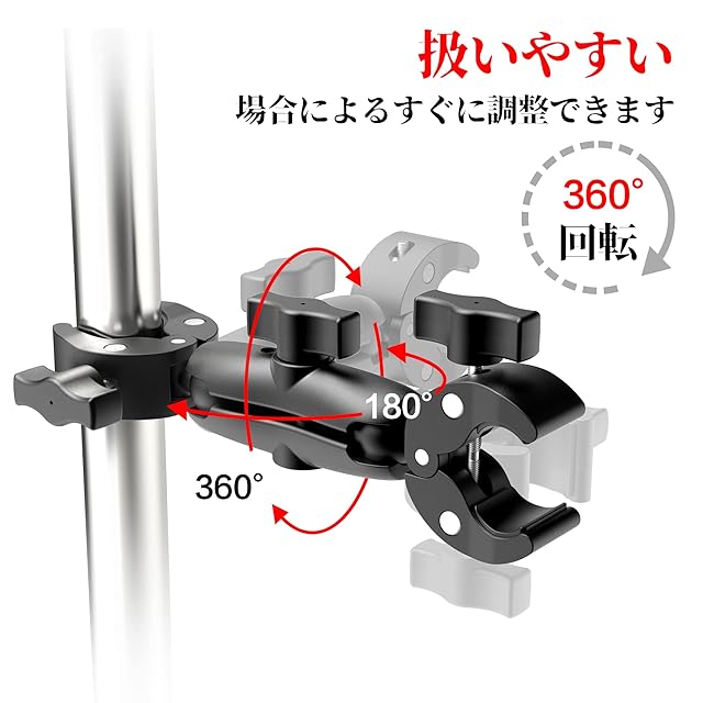 【ダブルクランプマウント】ダブルボール雲台+ダブルクランプの組み合わせで場所や用途に応じて大活躍できます。ダブルボール雲台によりクランプ両方も360度回転できて、縦でも横でも自由変換可能です。