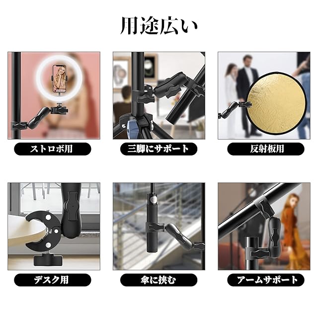 【多用途】クランプの開け口は最大3.96cmまで拡大されます。室内撮影に限らず、アウトドア活動なども活用できます。両端とも挟んで、パイプや傘などの接続に役立ちます。