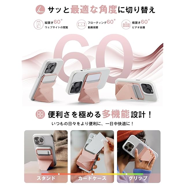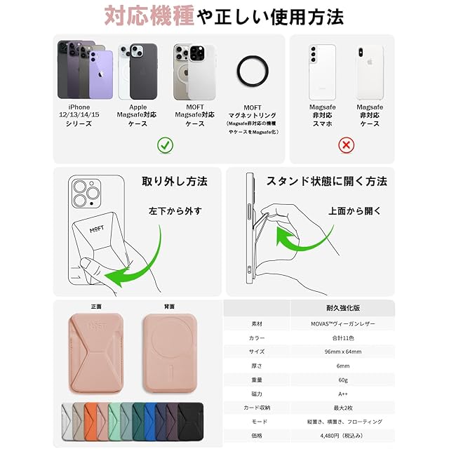 ✅【対応機種と注意事項】iPhone 16/15/14/13/12全シリーズに対応できます。または、MagSafe機能があるスマホケースやマグネットリングと併用することで使用可能です。*MOFT Snapケースと併用すれば、磁力がさらにアップ!