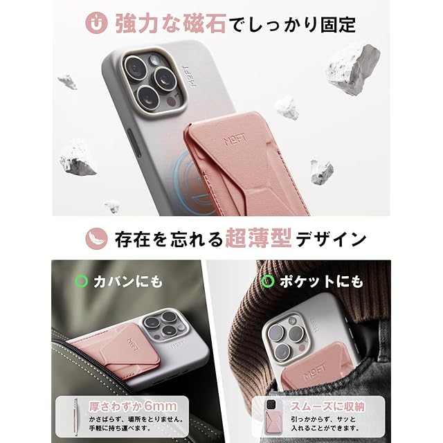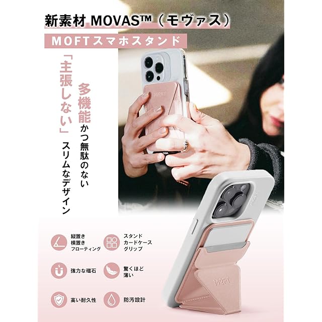 ✨【最新のヴィーガンレザー「MOVAS」採用!洗練されたスリムデザインで高耐久性】 「MOVAS」は、MOFTが誇りを持って開発したヴィーガンレザーで、その特長は一見の価値があります。この素材は驚くほど繊細な手触りを備えながら、同時に高い耐久性を持ち、さらには環境への優しさも追求しています。その結果、この素材を使用したスマホスタンドは、優れた張力と靱性を誇り、ポケットにキーホルダーやカードキーと一緒に収納しても傷がつきにくいのが特長です。洗練されたスリムデザインは、ユーザーに高級感をもたらし、日常のスタイリッシュな使い勝手を追求した結果として、このヴィーガンレザーのスマホスタンドは他と一線を画しています。