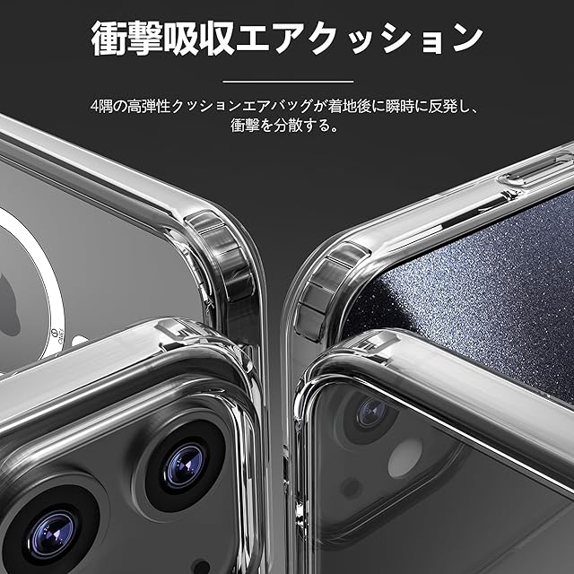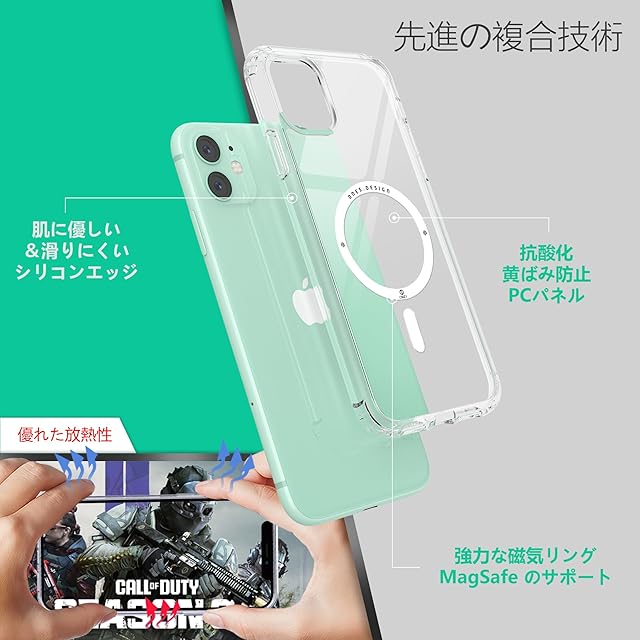 この iPhone11 用ケースは、MagSafe対応の高品質クリアケースです。高磁力のMagSafe磁気リングを搭載し、各種MagSafeアクセサリーとの互換性を確保しながら、Qi無線充電にも対応しています。耐衝撃性に優れたPC素材のハードバックパネルと、衝撃吸収力の高いTPU素材のソフトフレームを組み合わせたハイブリッド構造を採用。四隅には衝撃吸収エアクッションを内蔵し、米軍規格の耐衝撃性能を実現しています。画面とカメラレンズの周りは縁が高くなるよう設計され、デバイスを確実に保護。背面パネルには傷防止コーティングが施され、長期使用でも劣化しにくい高透明素材を使用しているため、 iPhone 11 本来の美しいデザインを損なうことなく楽しめます。薄型・軽量で持ちやすく、人間工学に基づいた設計により快適な握り心地を実現しています。