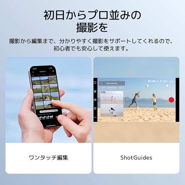 【初日からプロ並みの撮影を】 - Osmo Mobile 7をDJI Mimoとペアリングして、ShotGuidesとワンタップ編集を利用しましょう。プロのように撮影して編集し、時間を節約しながら創造的な作品を瞬時に洗練させます。