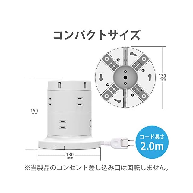 商品名:エレコム 電源タップ タワー型 延長コード [ 8個口 & USB×5ポート ] 固定パーツ付 雷ガード ほこりシャッター 2m ホワイト ECT-0620WH