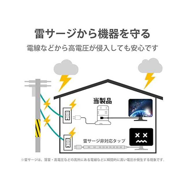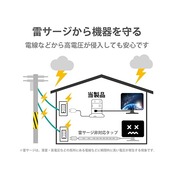 誘導雷による12500Vまでの雷サージを吸収する素子(バリスタ)を搭載し、接続機器を保護します。(※サージ電圧12500VはJEC210/212規格に基づく数値です。受けた電圧や回数により性能は劣化します。)