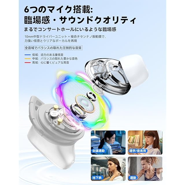 【Hi-Fi音質&臨場感あふれるサウンド】このインイヤーBluetoothイヤホンは10mmダイナミックドライバーを搭載し、迫力のあるサウンドを体感できます。全音域でバランスの取れた、圧倒的な高音質。 深く響く重低音 - 体の芯まで響くパワフルな低音 繊細な中音 - 楽器のディテールまで忠実に再現 クリアな高音 - 繊細でリアルな音の輝きを実現。