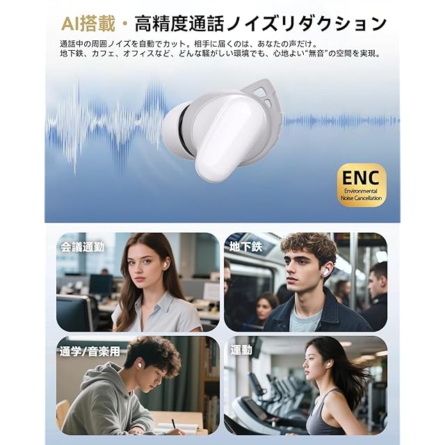 商品名:イヤホンBluetooth ワイヤレスイヤホン 6つのシリコンマイク搭載 AIスマートENC通話ノイズキャンセリング IPX7防水 最大65時間再生 2025年最新Bluetooth5.4ブルートゥースイヤホン 全音域HIFI音質低遅延接続瞬時Type-C 急速充電片耳/両耳 WEB会議/運動/ゲーム/通学通勤/スポーツ/音楽用 iPhone/Android対応