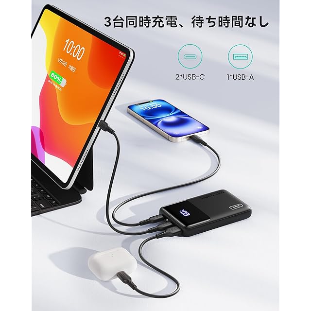 【3台同時充電、待機なし】外出中に複数のデバイスがバッテリー切れで困ることはありません。2つのUSB-C入出力ポートと1つのUSB-A出力ポートを備えており、最大3台のデバイスを同時に充電できます。