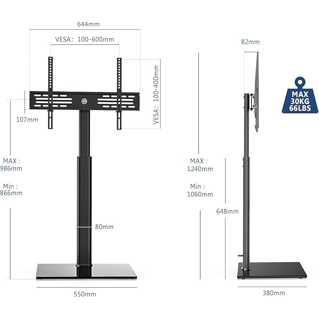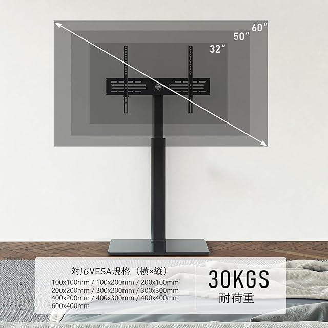 【VESA規格対応】汎用性の高いVESA規格(テレビ背面のネジ穴間の距離)対応、最小限は20×20cm、最大限は60×40cmです。当製品がほとんどの32~60インチのテレビやモニターに適応します。