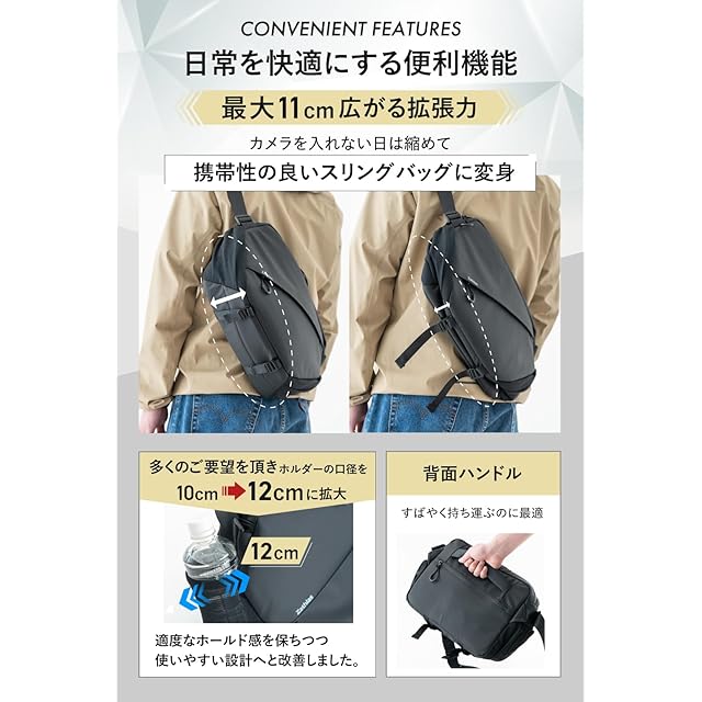 【拡張機能で収納力UP!シーンに合わせてサイズ調整】必要に応じてバッグのマチ幅を調整可能。カメラを使わない日はコンパクトに畳んで、撮影時には拡張することで、大型レンズや小物も収納可能です。