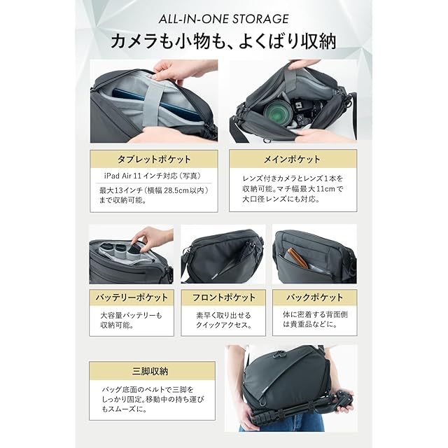 カメラバッグに見えない洗練されたデザインながら、機材に合わせてマチ幅を調整できる拡張機能を搭載。 コンパクトに畳んで普段使いもでき、撮影時には大型レンズやアクセサリーまでしっかり収納可能です。 底面の固定ベルトで三脚もスマートに持ち運べるので、移動時に手がふさがる心配もなし。 さらに、防水ファスナー採用で突然の雨でも機材をしっかり保護し、タブレット専用ポケットで撮影データの確認や編集もスムーズ。 わずか540gの軽量設計で、長時間の撮影でも快適に使えます。 ショルダー&スリングの2WAY仕様で使い方も自由自在。 撮影シーンに合わせて柔軟に対応できるこのカメラバッグで、快適な撮影ライフを実現しませんか?