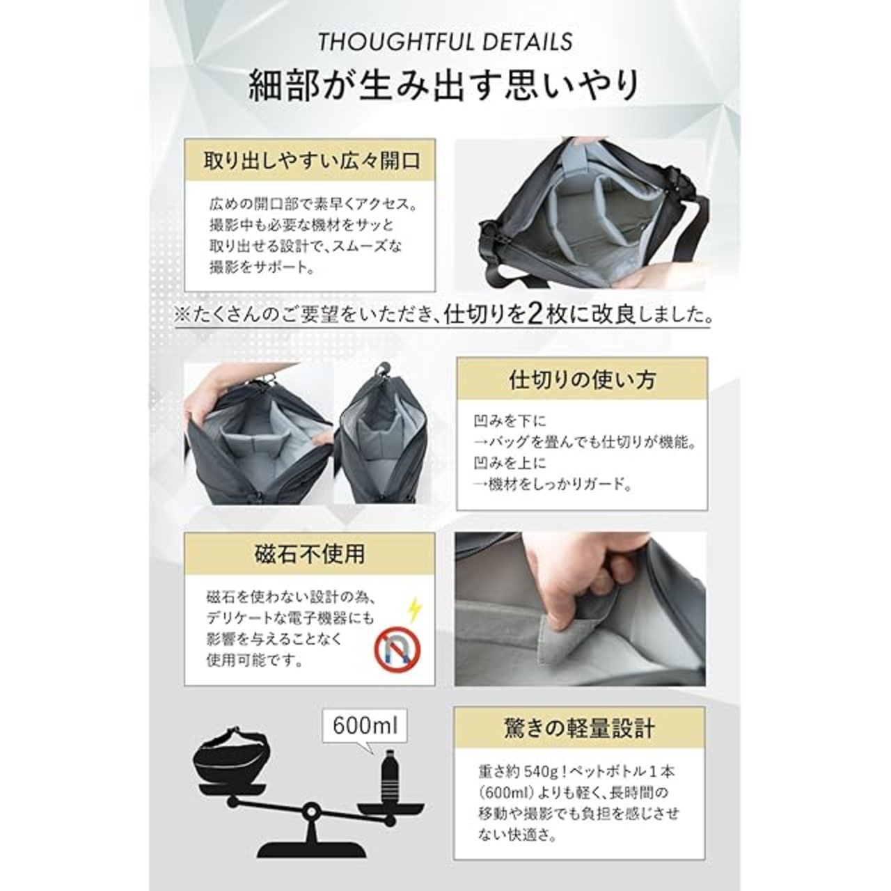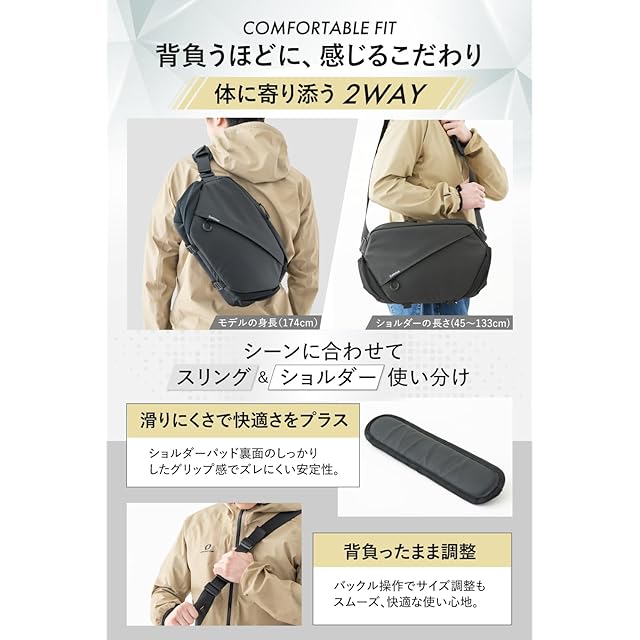 【軽くて持ち運びやすい!540gの軽さで長時間でもラクラク】わずか540gの軽量設計。ペットボトル1本分の軽さで、ショルダー・スリングバッグどちらでも快適に持ち運び可能。長時間の撮影でも負担を感じにくく、移動の多い撮影にも最適です。