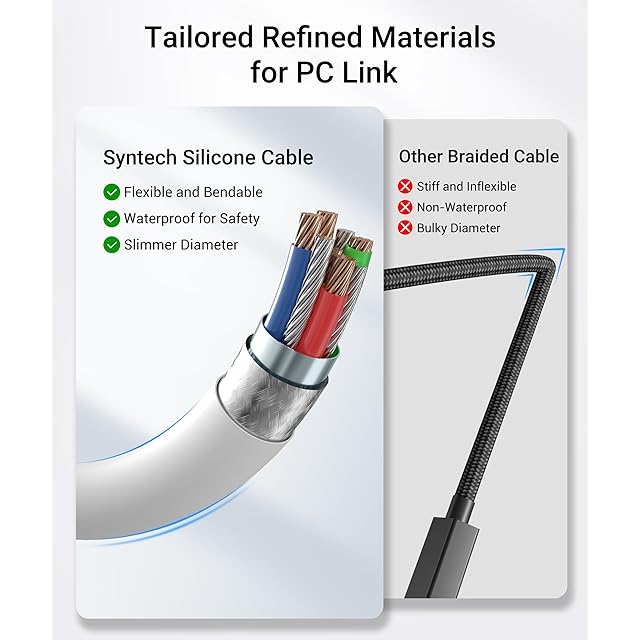 人間性あるデザイン:別のUSB C充電ポートにはインテリジェントなLEDインジケータが付いており、接続が成功すると点灯します。加えて、5メートルのQuest3S/3/2ケーブルは柔軟なPVCジャケットを誇り、ゲームプレイ中の動きの自由度を向上させています。また、SyntechはSyntechリンクケーブルに18ヶ月の心配なし期間と親切なカスタマーサポートを提供しています。