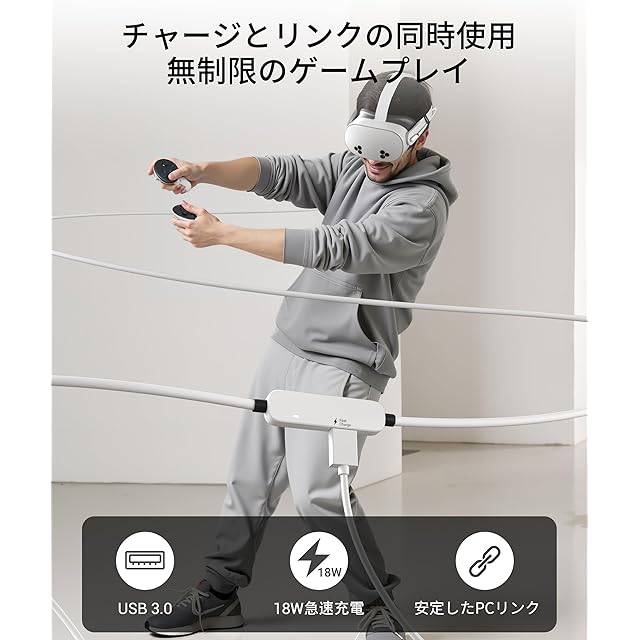 Quest 3S/3/2、Pico 4 に対応:Quest3/2は、Syntechによって製造されたOculusリンクケーブルと安全に互換性があります。リンクケーブルの別の充電ポートを元の充電器に接続することで、一日中の拡張VRゲームセッションが可能になります。(注釈:元のQuest2充電器は10Wの電力を提供します。ゲームプレイを中断せずにプレイするために、Quest2には18Wまたはそれ以上の電力の充電器を使用することをお勧めします)