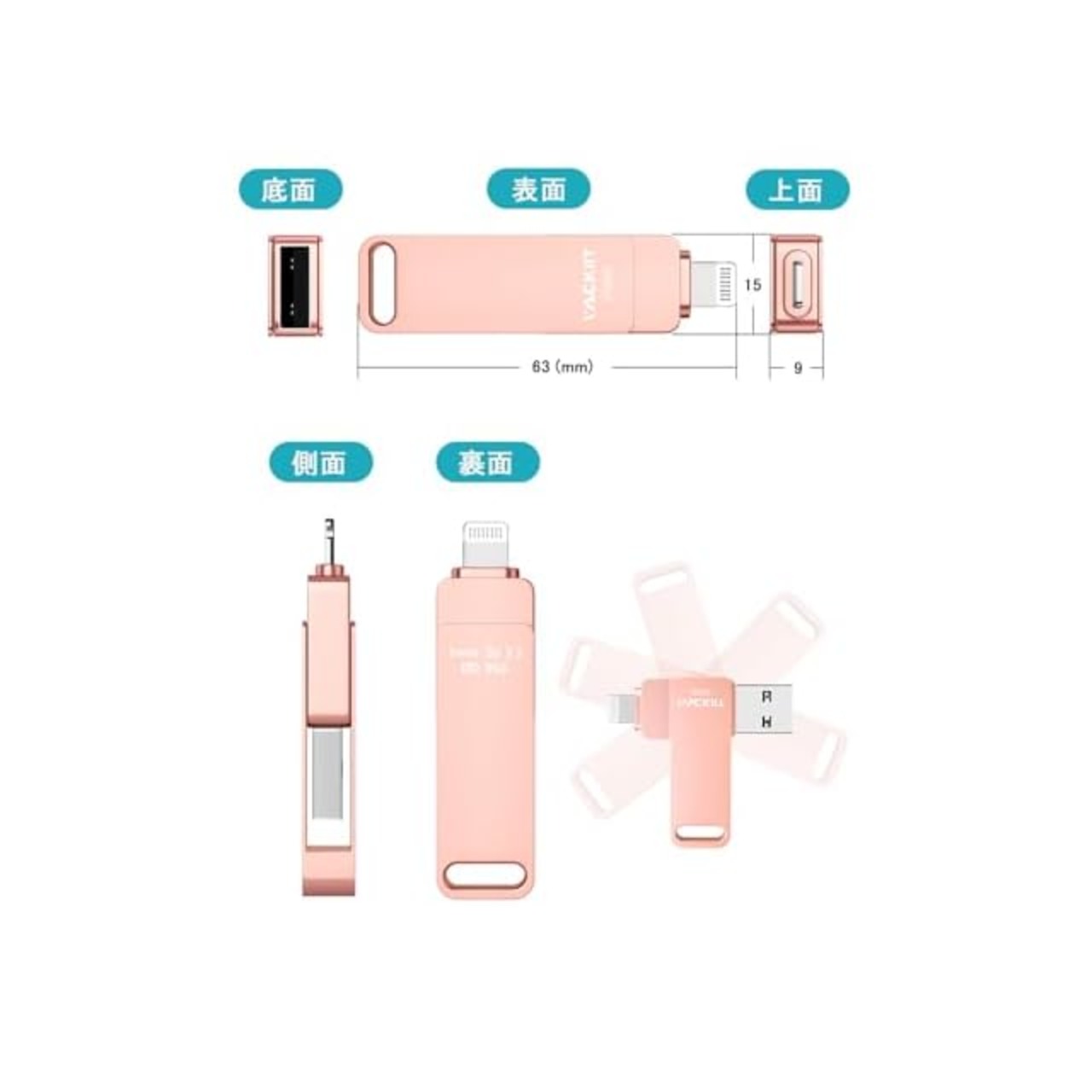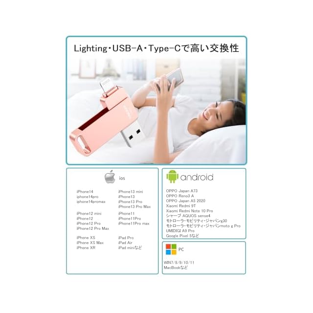 「スマホ容量対策のUSBメモリ・フラッシュドライブ」本スマホ USBメモは超軽量でコンパクトなスタイリッシュボディ、そしてキャップレスの360°回転式デザインで、どこにでも持ち運べます。スマホで撮った写真をフラッシュドライブに保存したい時、会議資料を素早く共有したい時、wifiとパソコンがない場合など便利で、旅行・通勤・会議に最適なiphone usbです。