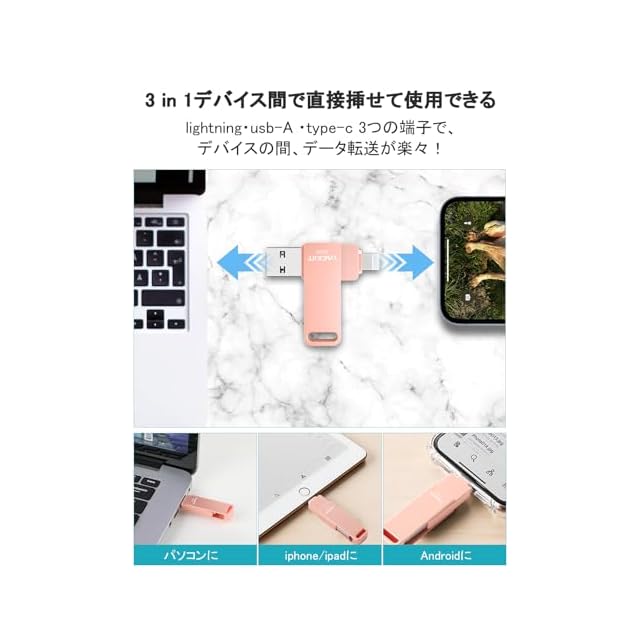 「3 IN 1 人気のランキングusb メモリiphone」当社のUSBメモリ・フラッシュドライブはlightning・usb-A ・type-c 3つの端子がつきので、iphone iPad iPod/Win Macではなく、Androidでも使用可能で、デバイスの間、データ転送が楽々!更に、当社のUSBメモリはUSB3.0対応でUSB2.0より性能アップさせ、高速なデータ転送を実現、大容量のデータや写真・ビデオも短時間で転送可能です。