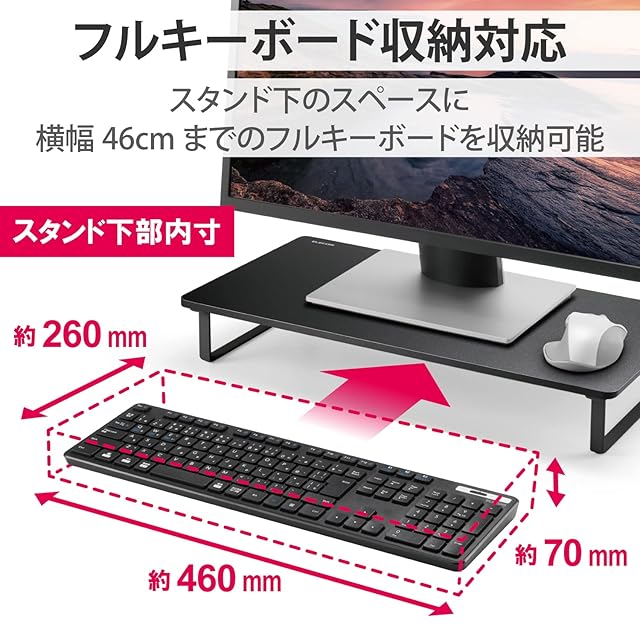 パソコン不使用時にはディスプレイスタンドの下のスペースに横幅46cmまでのフルキーボードを収納可能です。