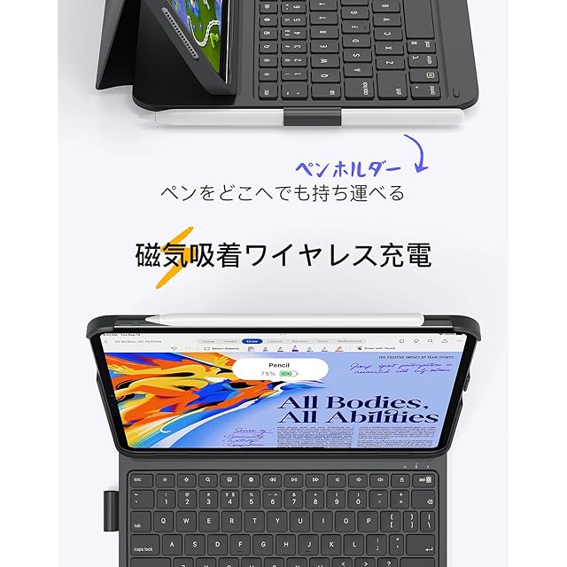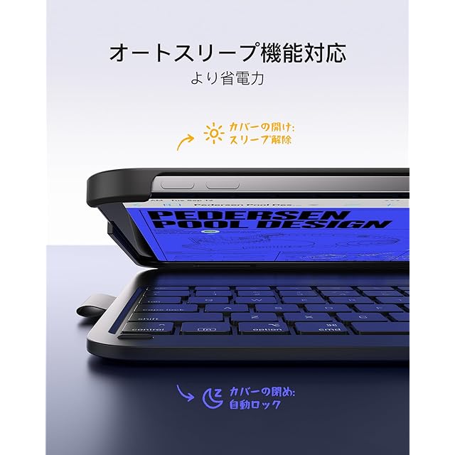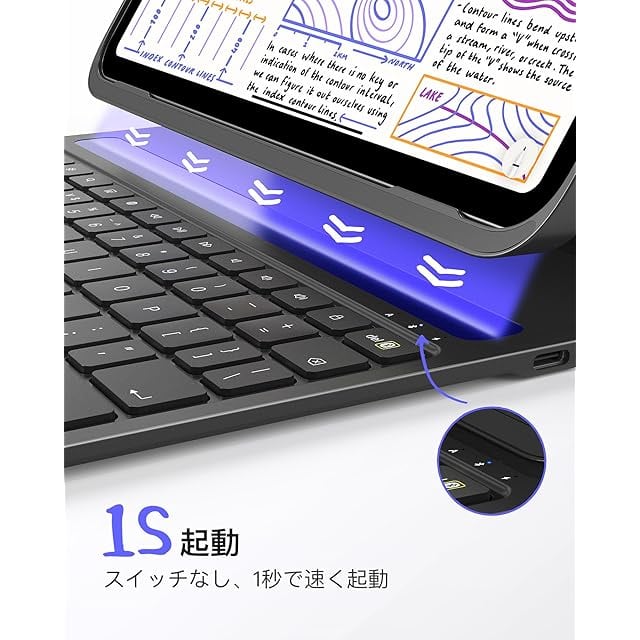 1秒起動:1秒未満でオンになります。iPadを立ち上げるとキーボードが自動的に電源が入ります。iPadを持ち上げるとキーボードの電源が自動的にオフになります。物理スイッチなしでより手間なく省電力です
