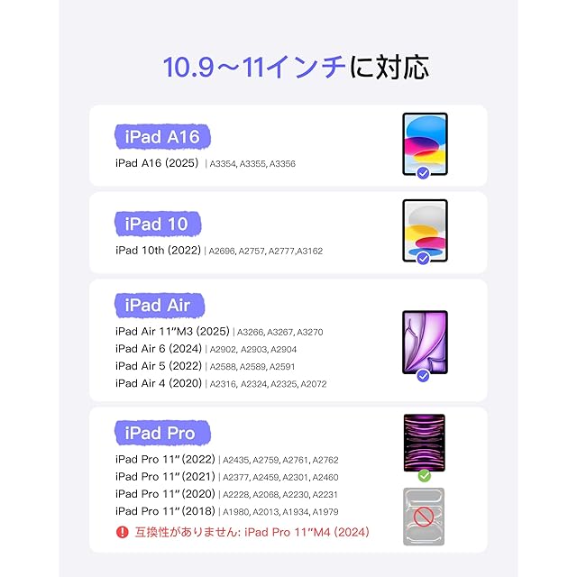 対応機種:当商品は、11インチiPad A16 第11世代2025/10.9インチiPad 第10世代2022、11インチiPad Pro 第4/3/2/1世代、iPad Air 11インチ M3 2025/M2 2024、iPad Air 第5世代/第4世代に特別に設計されています