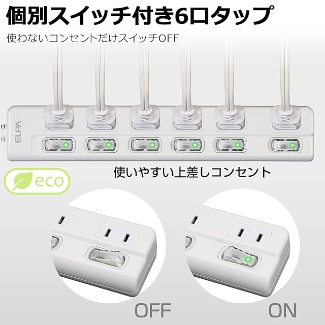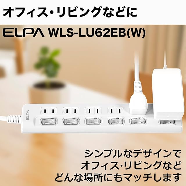 商品名:エルパ(ELPA) スイッチ付タップ コンセント 延長コード LED 上差し 6個口 2m WLS-LU62EB(W)