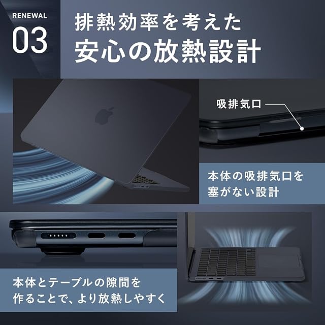 ◆MacBookに合わせた無駄のない放熱設計。MacBookの特徴である排気口やファンを必要としないファンレス設計を最大限に活かし、従来品にあった無駄な背面スリットをなくし、外観を損なわないスタイリッシュなカバーを実現。本体背部の通気孔は避けているので放熱能力も最大限発揮されます。更に、底部の四隅のゴム足設計により、テーブルとの間に隙間ができ、熱を流しやすくなります。また、ゴム足はテーブルとの摩擦が生じるため、本体が滑るのを防止できます。 超薄軽量、装着簡単上下カバー分離しており、単体使用が可能。機体にぴったり合わせて、取り付けや取り外しも簡単に操作できます。何度開閉してもMacBook本体の邪魔にならず、まるで何もつけてないかのように、薄くて軽く、持ち運びしやすいので、負担になりません。