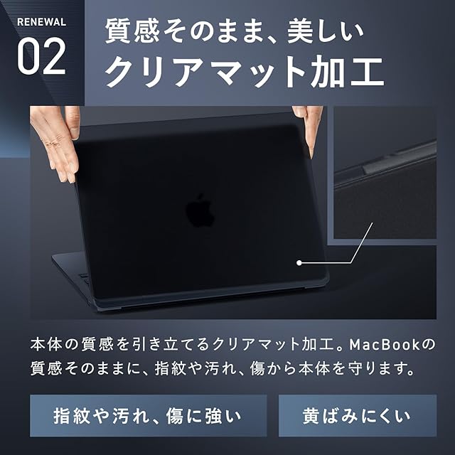 【MacBookの質感そのまま、美しいクリアマット加工タイプ】本体の質感を引き立てるクリアマット加工。MacBookの質感そのままに、指紋や汚れ、傷から本体を守ります。