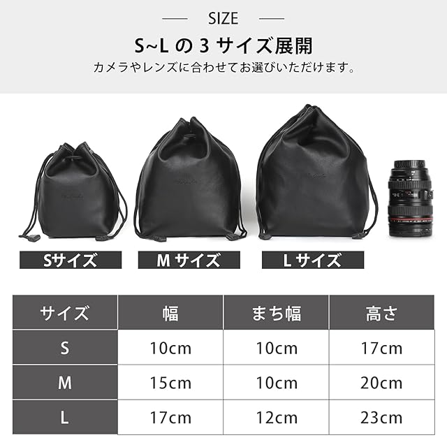 [FUPUONE] カメラケース カメラバッグ レンズケース 軽量 巾着型 ミニサイズ 裏地 フリース<br><br><br>カッコ良く上質感漂うPU加工されたレンズケース。出し入れしやすい巾着型で大人カジュアルに合わせやすく、普段使いもばっちりなショルダーバッグ。Sサイズでも小型ミラーレスカメラがすっぽり入ります。<br><br>底面はしっかりと広く自立するので中身の出し入れが楽々。内側は厚みのあるフリース素材で大切なカメラやレンズをしっかり守ります。オープンポケットもあるのでSDカードの予備やバッテリー等もセットで持ち運べて便利です。<br><br>ご近所撮影から本科的な望遠撮影まで幅広く対応できるスリーサイズ。雨や汚れに強く丈夫なPU加工製なので、ハードな現場にも身軽に持ち運べます。丈夫で長く使える相棒としてご愛用頂けるアイテムです。<br><br>魅力あふれる2カラー。クールでダンディーなブラックも、優しくスタイリッシュなチョコレートブラウンも上品な光沢がありファッションに合わせやすく年齢や性別を選びません。高級感があるので大切な方への贈り物にもお勧めです。<br><br>【素材】PU+フリース【カラー】ブラック、ブラウン【サイズ】S : 幅10㎝ マチ幅10㎝ 高さ17㎝ M : 幅15㎝ マチ幅10㎝ 高さ20㎝ L : 幅17㎝ マチ幅12㎝ 高さ23㎝
