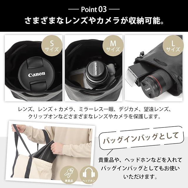ご近所撮影から本科的な望遠撮影まで幅広く対応できるスリーサイズ。雨や汚れに強く丈夫なPU加工製なので、ハードな現場にも身軽に持ち運べます。丈夫で長く使える相棒としてご愛用頂けるアイテムです。