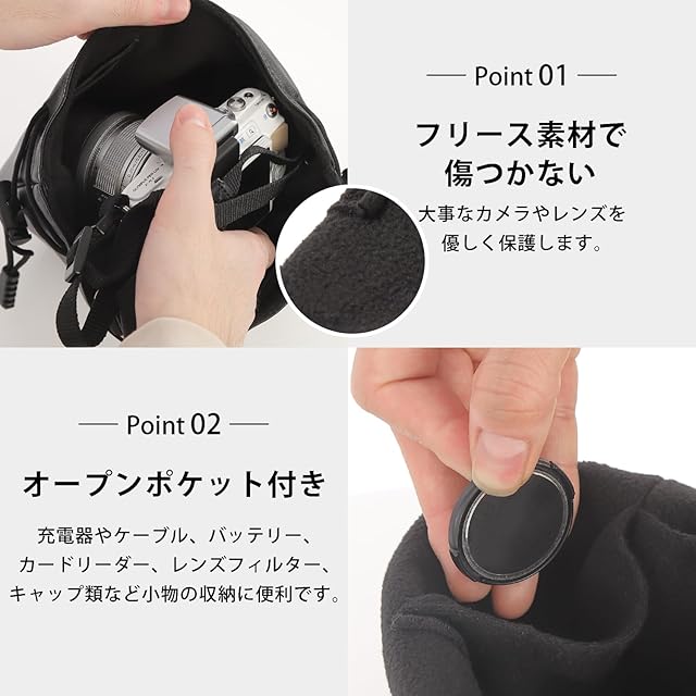 商品名:[FUPUONE] カメラバッグ レンズケース 軽量 巾着型 ミニサイズ 裏地 フリース (ブラック, L)