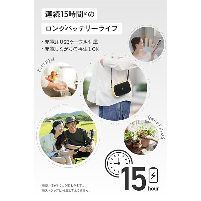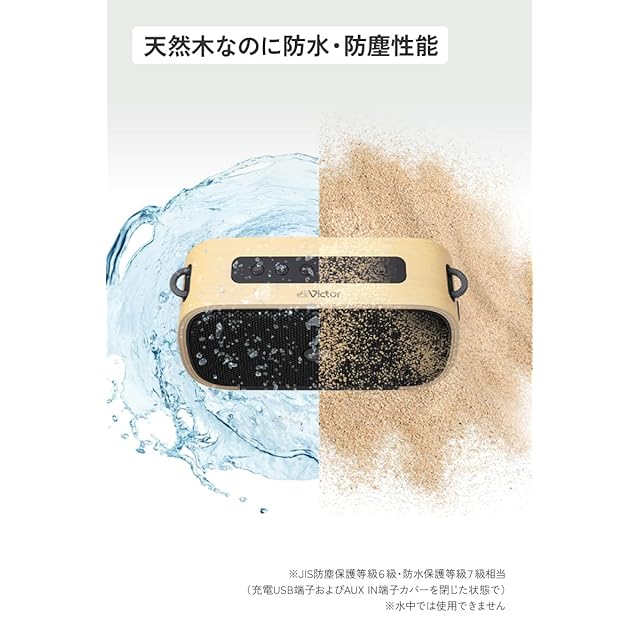 ✅天然木※1なのに水回りで使える___世界に一つだけの自然な木目や風合いを楽しめる天然木(バスウッド、ウォールナット)を採用したインテリアと調和するデザイン。なのに、お風呂やキッチンなどで使える防水・防塵仕様(IP67相当※2)です。 ※1:天然木を使用しているため、1台1台外観は異なります。※2:JIS防塵保護等級6級・防水保護等級7級(IP67)相当。充電用USB端子およびAUX IN端子のカバーを閉じた状態による。