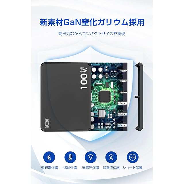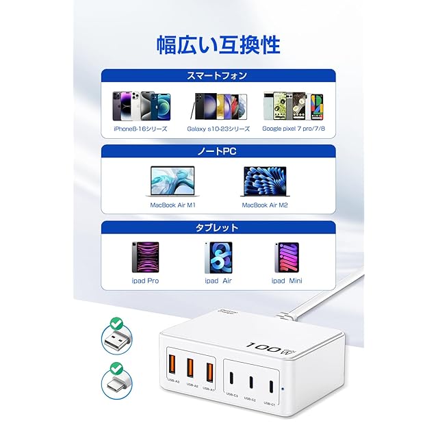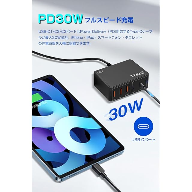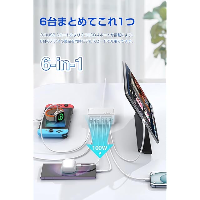 【合計100WマルチポートUSB充電器】3つUSB-Cポート、3つUSB-Aポートを搭載していて、まとめて6台のデバイスを同時に充電できる100W卓上充電器です。外出先や忙しい生活の中で充電待ち時間を大幅に短縮し、充電のストレスから解放され、日常生活がより快適に!