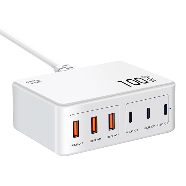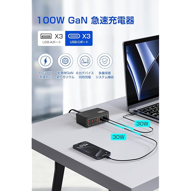 この急速充電器は、最大100Wの合計出力で、同時に6台のデバイスを充電できます。3つのUSB-C ポートと3つのUSB-A ポートを備え、iPhone、Android、タブレットなどさまざまな機器に対応しています。コンパクトなサイズながら、PD 30W と QC 3.0 の急速充電機能を搭載し、効率的に充電できます。ACアダプターとしても使用でき、充電ハブやモバイルバッテリーとしても活躍します。旅行や出張、オフィスなど、場所を選ばず活用できる便利な充電器です。