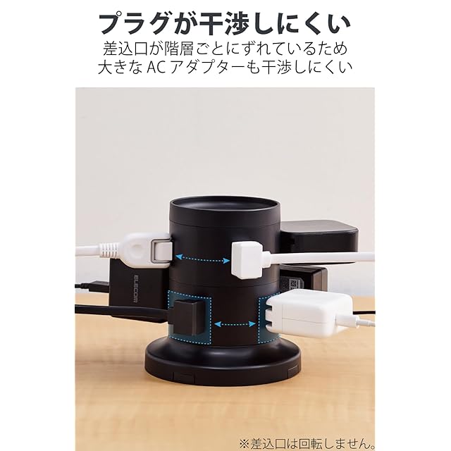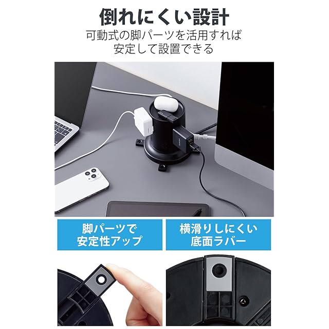 タワー型のため、差込口が多くても小さな面積で設置でき、360度あらゆる方向から接続できるので、会議室のデスクなどでの使用に便利です。