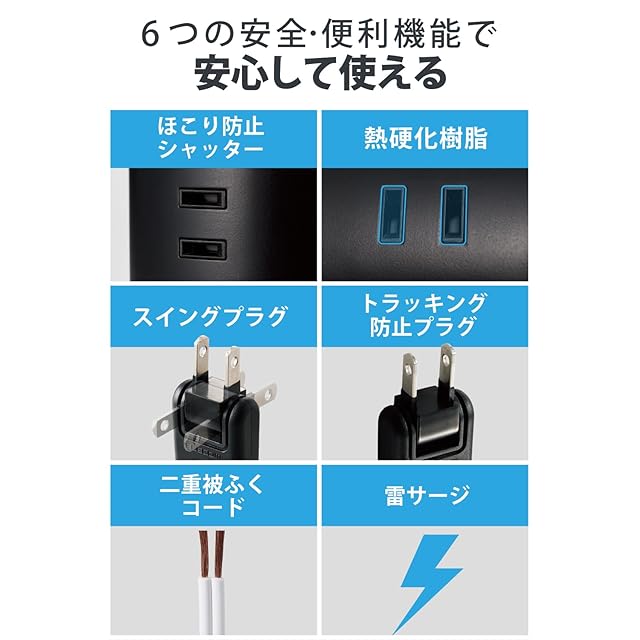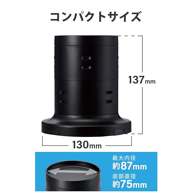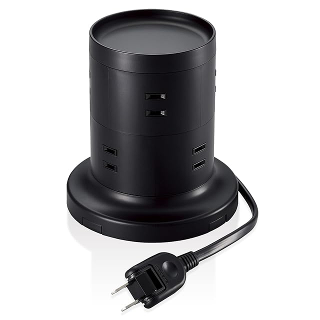 比較的小さな面積で設置ができ、360度あらゆる方向から接続できる8個の差込口を備えたタワー型の電源タップです。製品上部はトレー形状になっており、一時的に取り外した充電器などの小物を収納しておくことができます。二重構造の差込口やホコリ防止シャッターなどの安全機能、雷ガードやスイングプラグなどの便利機能を備えた使いやすい製品です。