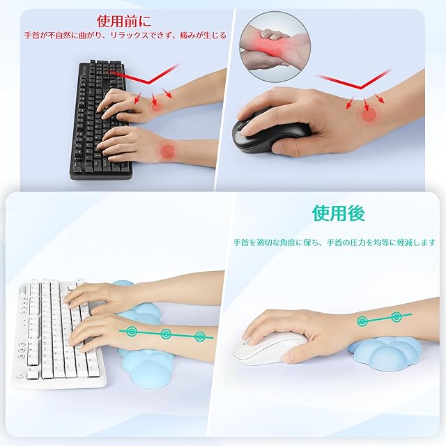 エルゴノミック クラウド型デザイン:特別なクラウド型デザインが手首にぴったりフィットし、手首が正しくアラインされることで、手首と腕の圧力を瞬時に軽減し、まるで雲の中にいるかのような感覚を提供します。凹凸のある表面デザインにより、手首の空気循環が促進され、汗を防ぎます。手根管症候群(CTS)の改善に効果的です