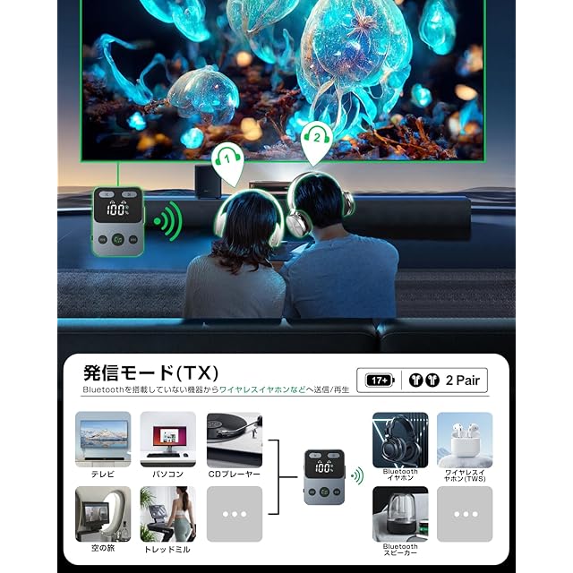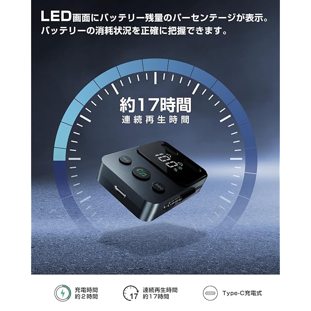 【送信機(トランスミッター)モード】2台のワイヤレスイヤホンなどに同時再生可能、フル充電後、最大17時間連続使用可能で、長時間のフライトにも十分対応できます。